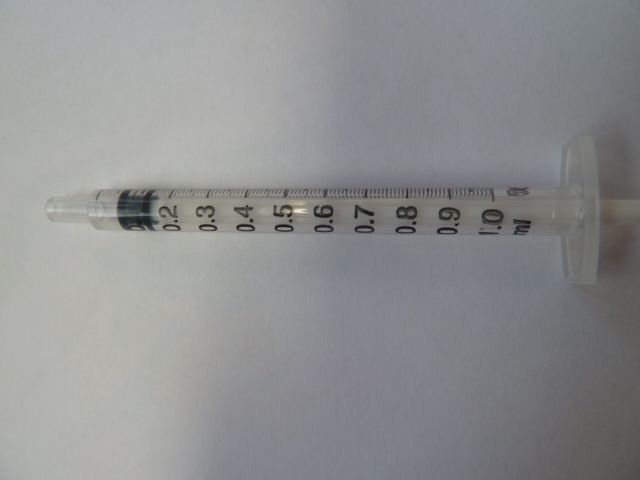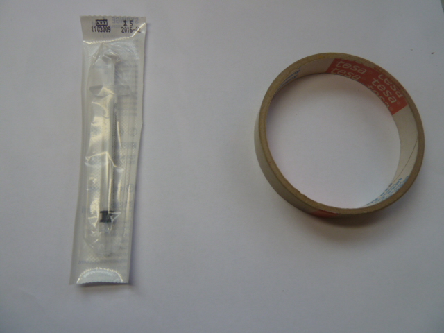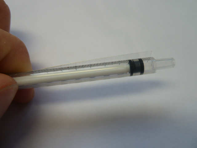 Hierfür habe ich einen Streifen TESA-Film verwendet, und ihn einfach über die Spritze geklebt: