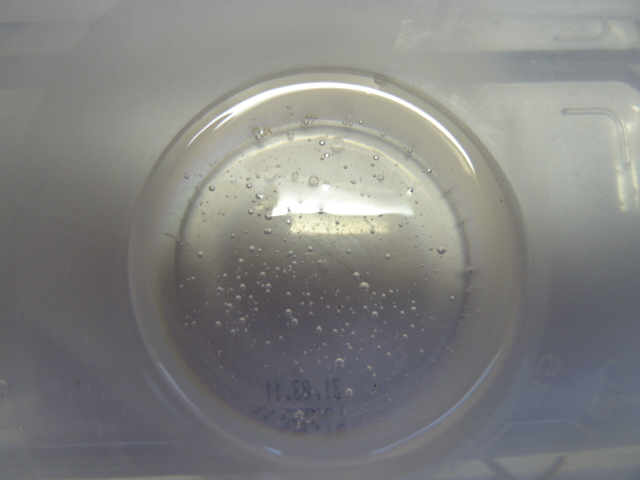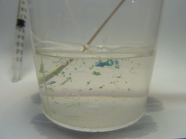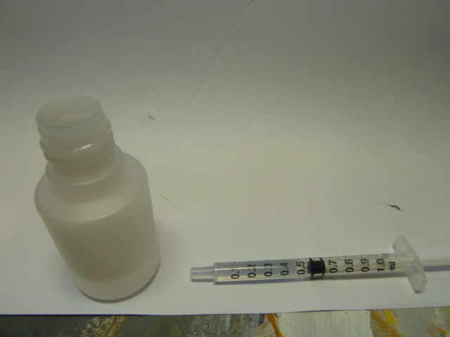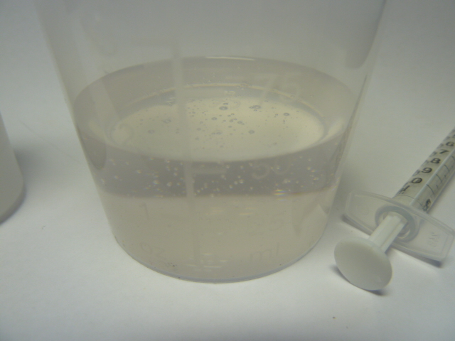 Hat man die Luftblasen alle raus, kommt der Härter und eventuell Farbe ins Spiel. Der Härter wird im Verhältnis 1 zu 100 zugegeben. D.h. in diesem Beispiel kommen zu 50ml Wassereffekt 0,5ml Härter dazu: