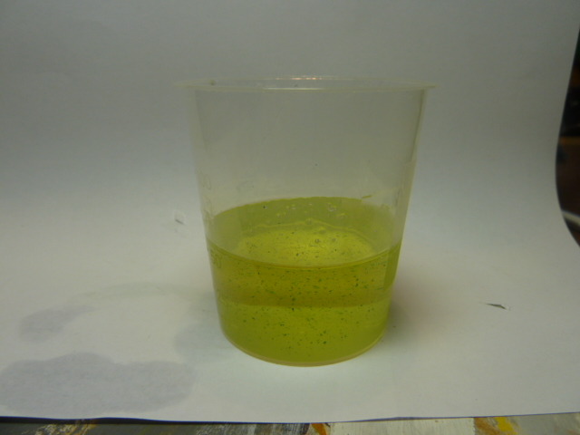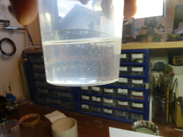 Hat man alles vermischt, und beginnen die Komponenten miteinander zu reagieren, färben sie sich und alles ähnelt einem Menschlichen Abfallprodukt, das ich jetzt nicht beim Namen nennen will. Das hat aber nichts zu bedeuten. Wenn man das richtige Mischverhältnis von Härter zu Wassereffekt 1-100 eingehalten hat, härtet alles vollkommen transparent aus. Also keine Panik wenn alles Gelb ist.