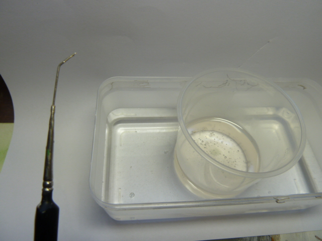 Hierfür verwende ich ein Werkzeug das ich auf BADSMILE´s Modellierworkshop gemacht habe. Eine Nadel am Ende eines alten Pinsels. Aber letztendlich eignet sich jedes spitze Werkzeug, mit dem man Blasen platzen kann.