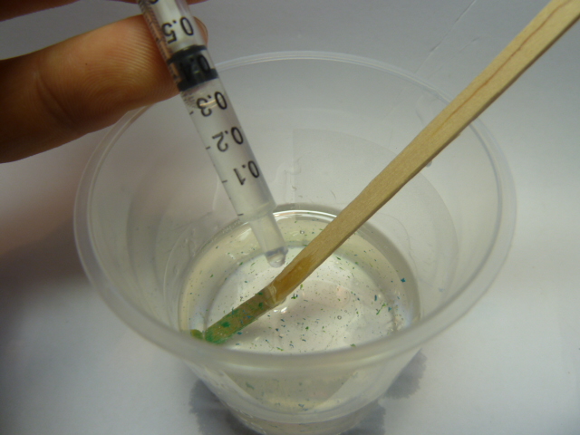 Nun wird der Härter zugegeben, und alles gut und sehr gründlich gemischt. Ein Holzstab wie der hier gezeigte eignet sich besser als zum Beispiel ein Zahnstocher oder ein Schaschlikspieß, da der Holzstab durch seine Breite ganz einfach mehr Masse bewegt und diese auch anders bewegt. Er verwirbelt es und ein Zahnstocher schneidet mehr durch die Masse, als das er sie vermischt. Auch wichtig zu beachten ist es, das man laaaaaaangsam rührt. Dadurch vermeidet man den Einschluss von Luftblasen.