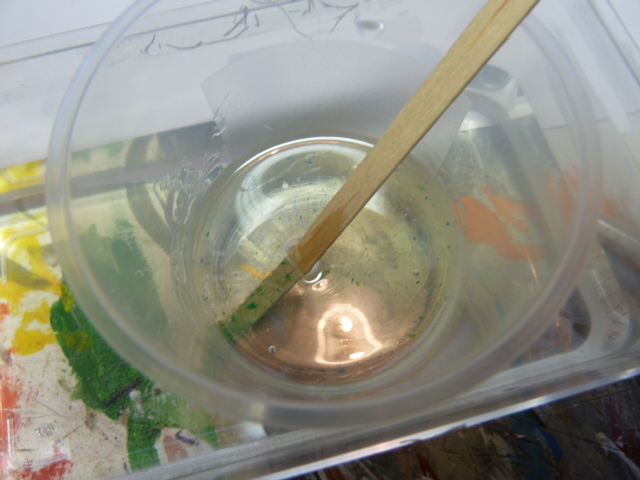 Wenn man das Wasser ein wenig einfärben möchte, kann man auf die Spitze seines Rührstabes ein wenig Farbe geben und diese so beim mischen einarbeiten.