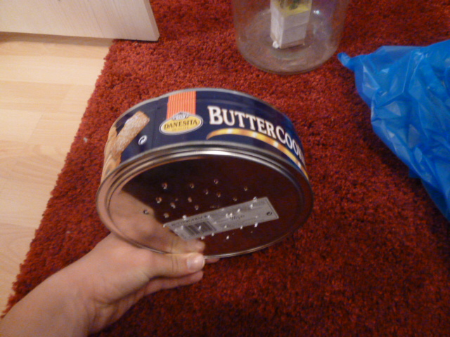 Dann kommt oben ein Deckel drauf. Ich verwende hierfür eine Keksdose mit Löchern drin, damit später die Luft aus dem Glas entweichen kann.